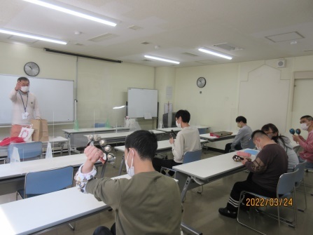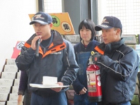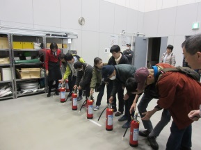 11月20日(金)、会館2階が火元と言う設定で実際に火災報知ベルが鳴り、館内放送の指示で避難し、消火器の使い方などの講習が行われました。