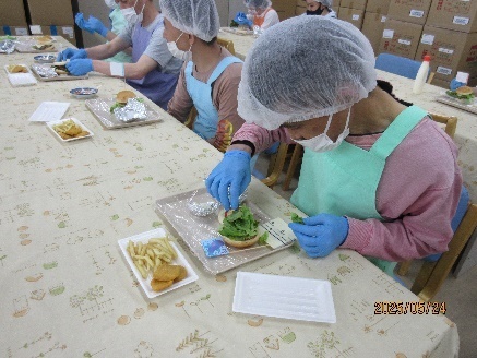 事前に<チーズバーガー>か<エビカツバーガー>を決めて頂きました。玉ねぎをカットしたり、レタスを洗ったり順番に工程を体験。一人分ずつのトレーに材料を用意、ホットプレートでお肉を焼いて所内はいい匂いに包まれました。セットメニューに必要なポテト・チキンナゲットも準備し、いざ!「自分のやってみたいように作ってみよう~」の合図で一斉にとりかかりました。自分で作ったバーガーを写真で撮ったり色々楽しんでから頂きました。