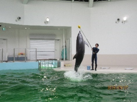 お腹もいっぱいになり、本日のメイン「イルカちゃんに会いに行こう!」っと出発、駐車場へ入るのに少し迷いましたが目的地に到着、受付中にガラス越しにイルカさんが!「あ~!しっぽが見えた!」「奥の方で寝てる?」などちらっと見えると大歓声が上がりました。