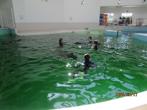 プールがある2階に移動すると、目の前に大きなプールで気持ちよく泳ぐイルカさんが!