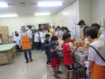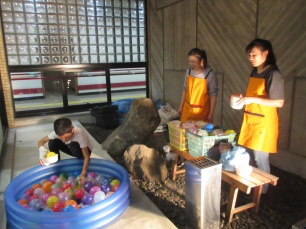 お昼ご飯が終わると、プチ夏祭りの準備をみんなでしました。今年はスタッフ手作りのゲーム、エアーホッケー・コリントなど、ゲーム三昧で盛り上がりました。