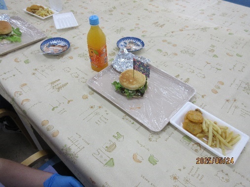 事前に<チーズバーガー>か<エビカツバーガー>を決めて頂きました。玉ねぎをカットしたり、レタスを洗ったり順番に工程を体験。一人分ずつのトレーに材料を用意、ホットプレートでお肉を焼いて所内はいい匂いに包まれました。セットメニューに必要なポテト・チキンナゲットも準備し、いざ!「自分のやってみたいように作ってみよう~」の合図で一斉にとりかかりました。自分で作ったバーガーを写真で撮ったり色々楽しんでから頂きました。