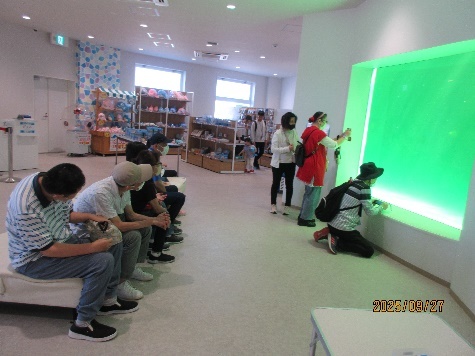 お腹もいっぱいになり、本日のメイン「イルカちゃんに会いに行こう!」っと出発、駐車場へ入るのに少し迷いましたが目的地に到着、受付中にガラス越しにイルカさんが!「あ~!しっぽが見えた!」「奥の方で寝てる?」などちらっと見えると大歓声が上がりました。