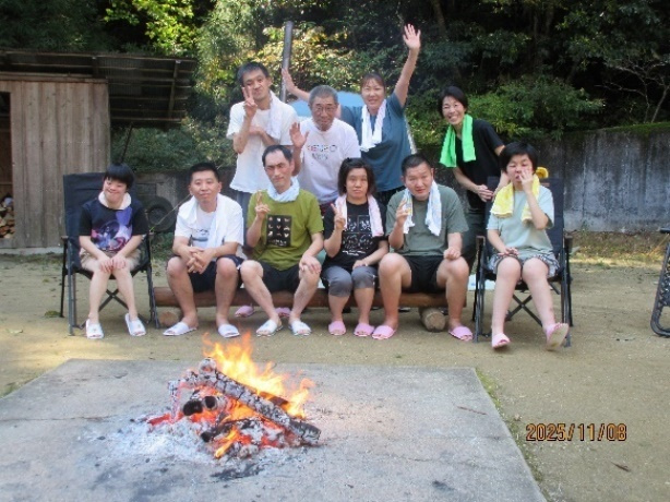「テントサウナってどんな感じかな?」「サウナめしって何かな?」など参加される利用者さんも当日までワクワクでした。現地に到着し、着替えて、いざテント前へ!テント前ではスタッフさんが準備して下さっていて、すぐに体験が始まりました。
