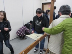 地震の後は火災避難体験、煙の特性などのお話を聞き体験ゾーンへ・・・「体験用に作られた煙はバニラのにおいがするのですが、姿勢を低くして口に手をあてたり、ハンカチで押さえて煙を吸わない様避難して下さい!」っと。順番に入っていったのですが、体験最中に「えらい煙やな~!あ~なんかバニラの匂いするわぁ~」という声が聞こえてきて一斉に苦笑い((+_+))